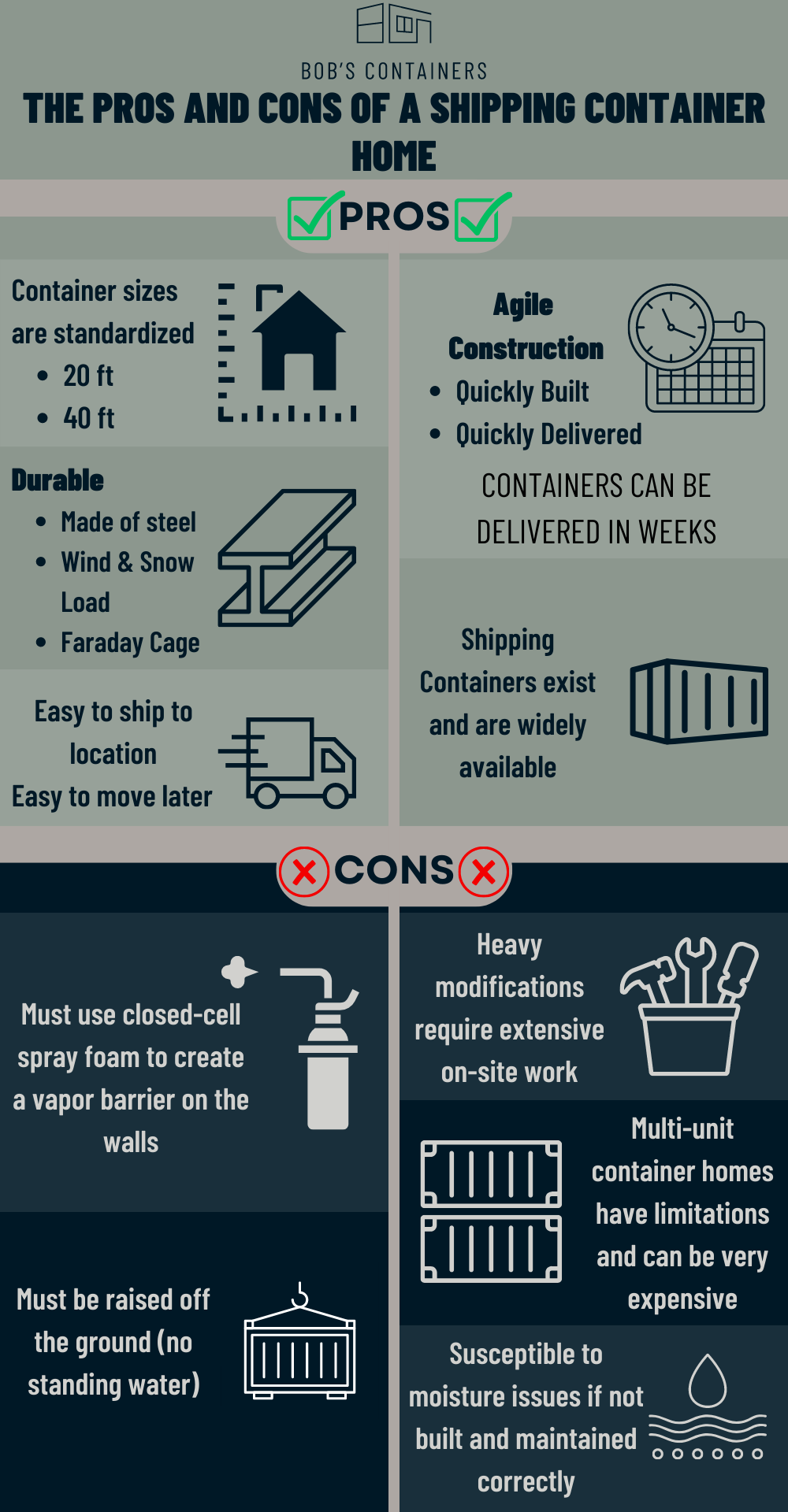 There is a ton of information out there on whether shipping containers make good form factors for homes. We may be a little biased, but we think container homes are pretty awesome. They do certainly have some drawbacks and we do our best to educate our customers on how to mitigate some of the shortfalls of containers. Each type of home has it’s own set of complications and needs for upkeep. The small size of these shipping containers promotes a minimalist lifestyle with far fewer things to go wrong compared to a few thousand square foot house. Take a look at the pros and cons in the infographic below.